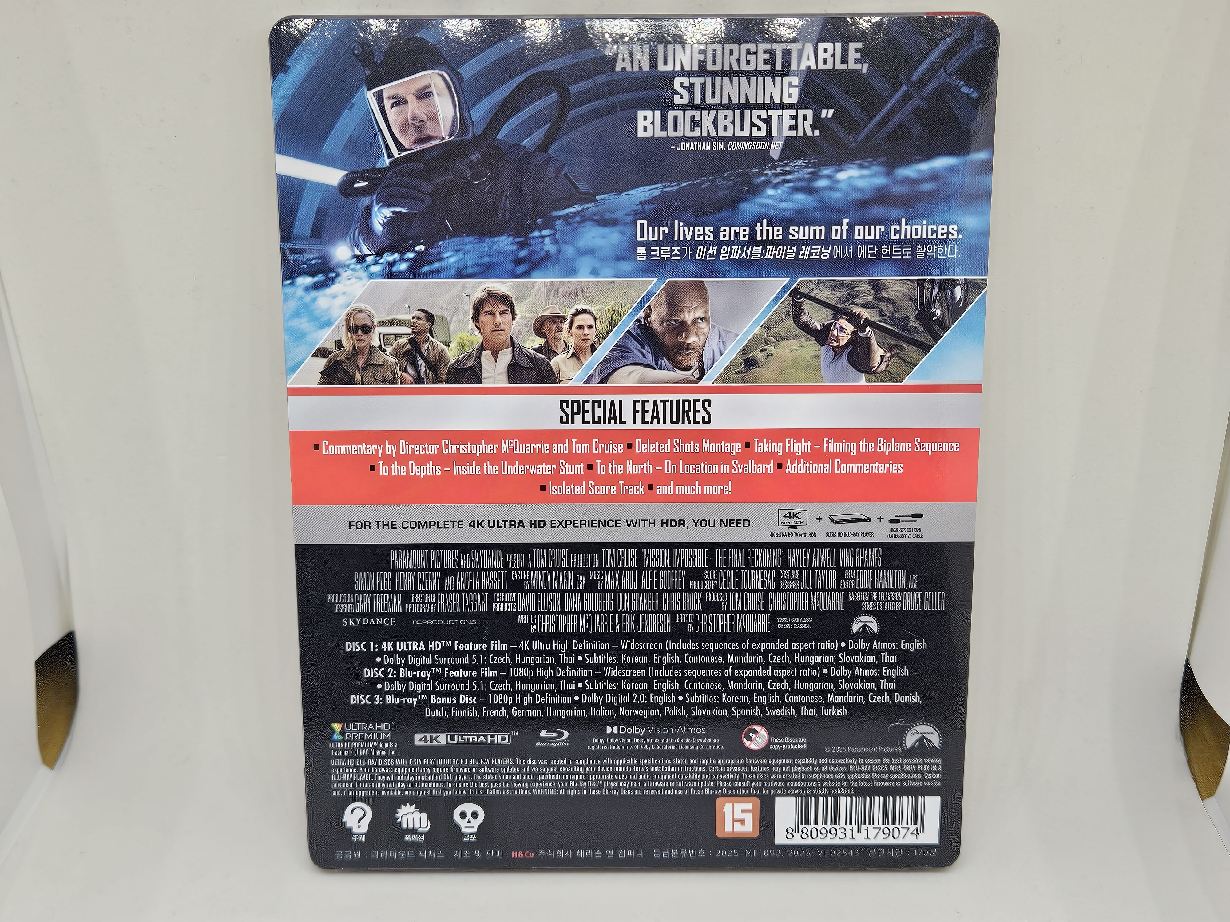 4K, 2K, 부가영상 이렇게 3장으로 구성되어 구성되어 있습니다. 커멘터리도 감독+탐 크루즈, 감독+편집자, 감독+음악 3개나 제공되며 우리말 자막이 제공되는군요.